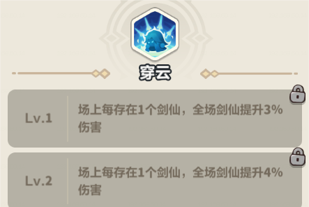 【穿云】:场上每存在1个剑仙,全场剑仙提升一定比例伤害。