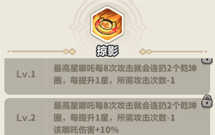 【掠影】:最高星哪吒每进行一定次数攻击就会连扔2个乾坤圈,每提升1星,所需攻击次数-1。